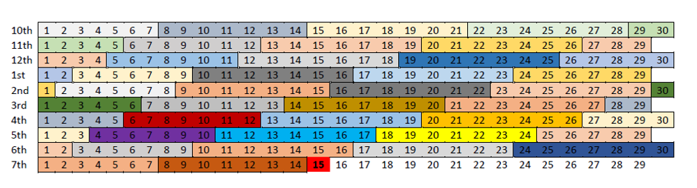 The purpose of this chart is to count a 40-week pregnancy, the colors do not represent anything special it is just one more way for me to cause you to buy more printer ink.